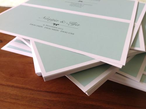 Die Gestaltung der Karten habe ich übernommen, dabei habe ich mich von "Tiffany" (Design und Farbe) inspirieren lassen. Ich ließ es bei Flyeralarm drucken, die Bestellung verlief reibungslos (schnell und einfach), letzte Woche habe ich die Karten erhalten. Jetzt bin ich dabei alle Einladungskarten zu beschriften und verpacken, damit die gleich am Montag rauskommen.